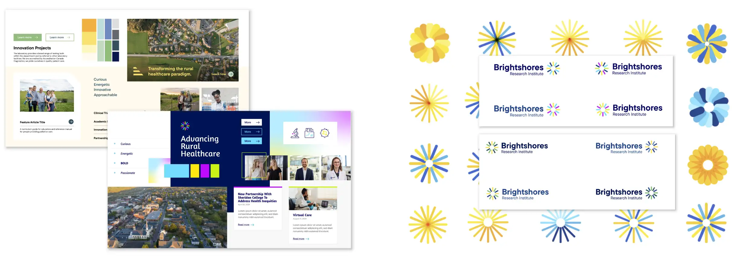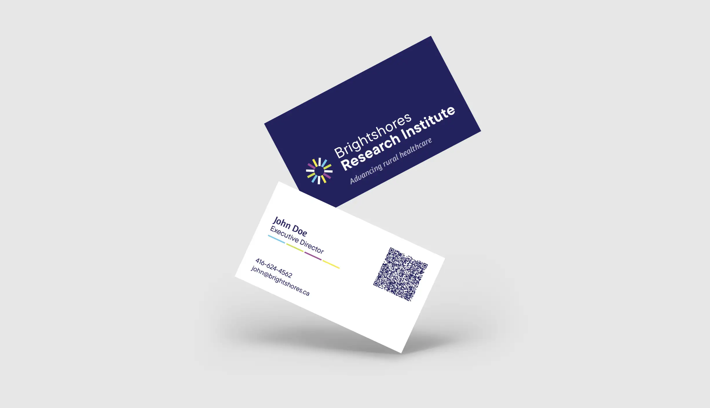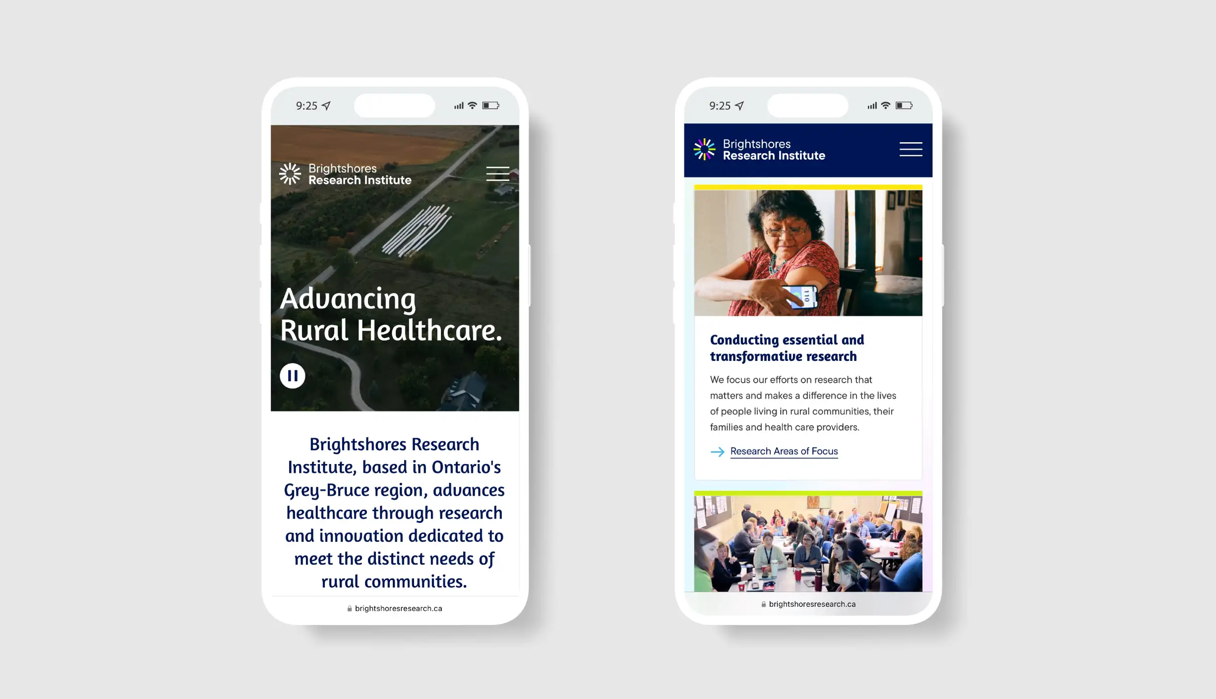 The team explored and presented various style boards, each offering a distinct visual direction for the overall look and feel of the brand. The chosen direction uses bright colours and authentic, relatable imagery to position Brightshores Research Institute as a beacon of optimism and innovation in their community and the rural health space at large. To ensure the visuals were authentic to the community they represent, imagery was sourced from a local photographer in the Grey Bruce region.