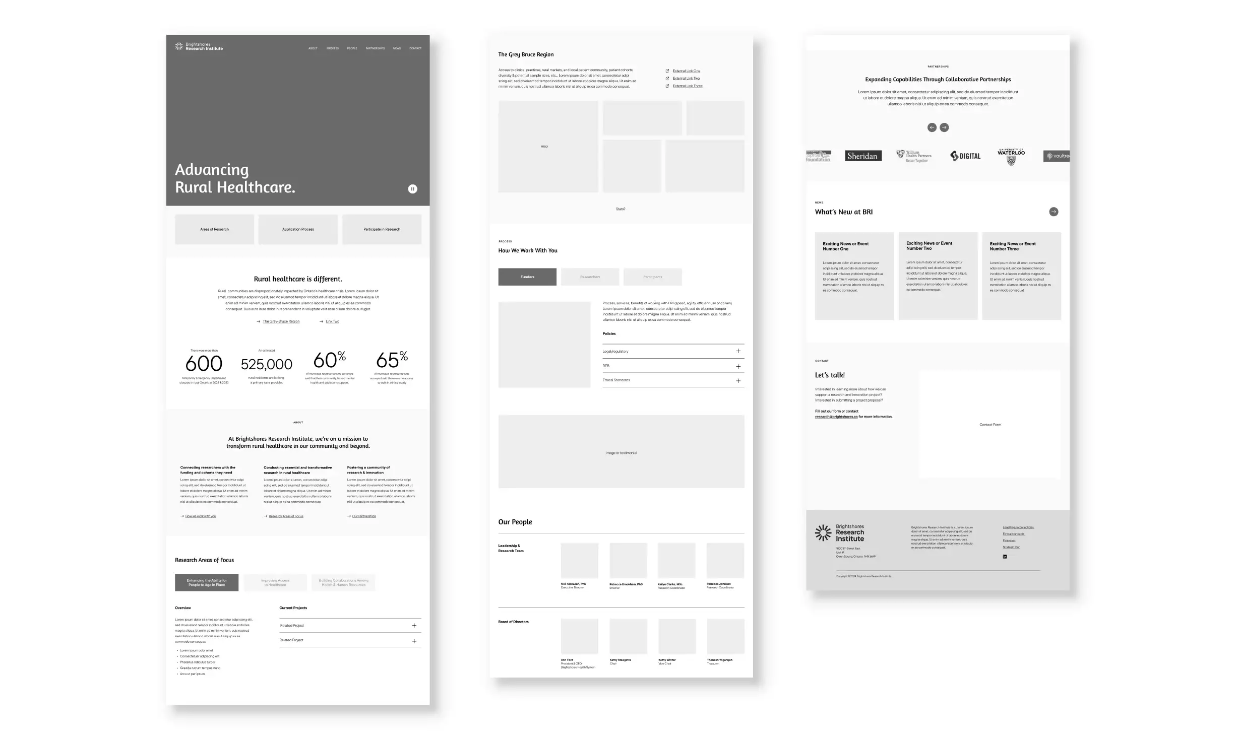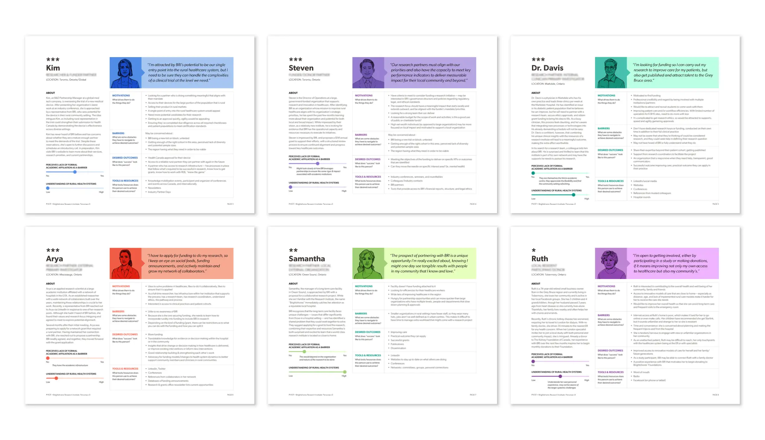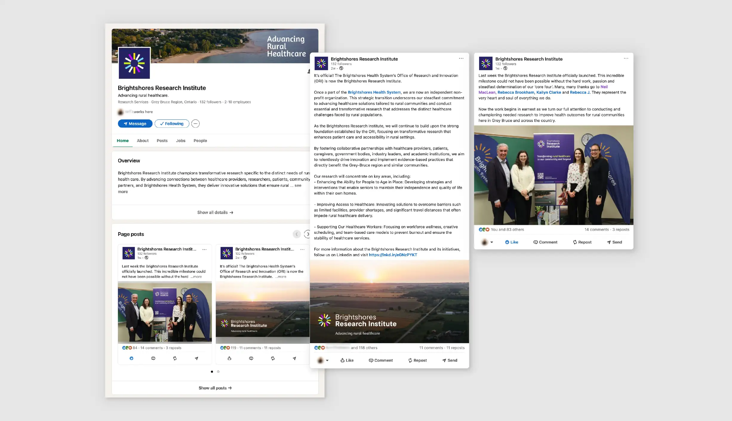 The team explored and presented various style boards, each offering a distinct visual direction for the overall look and feel of the brand. The chosen direction uses bright colours and authentic, relatable imagery to position Brightshores Research Institute as a beacon of optimism and innovation in their community and the rural health space at large. To ensure the visuals were authentic to the community they represent, imagery was sourced from a local photographer in the Grey Bruce region.